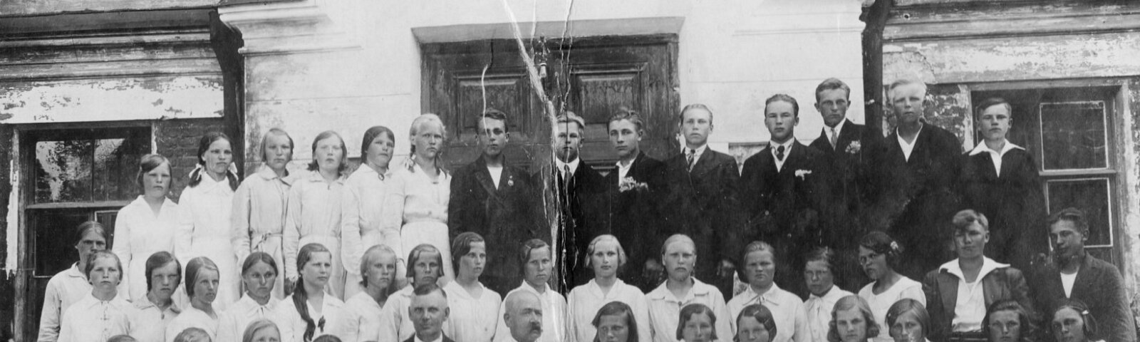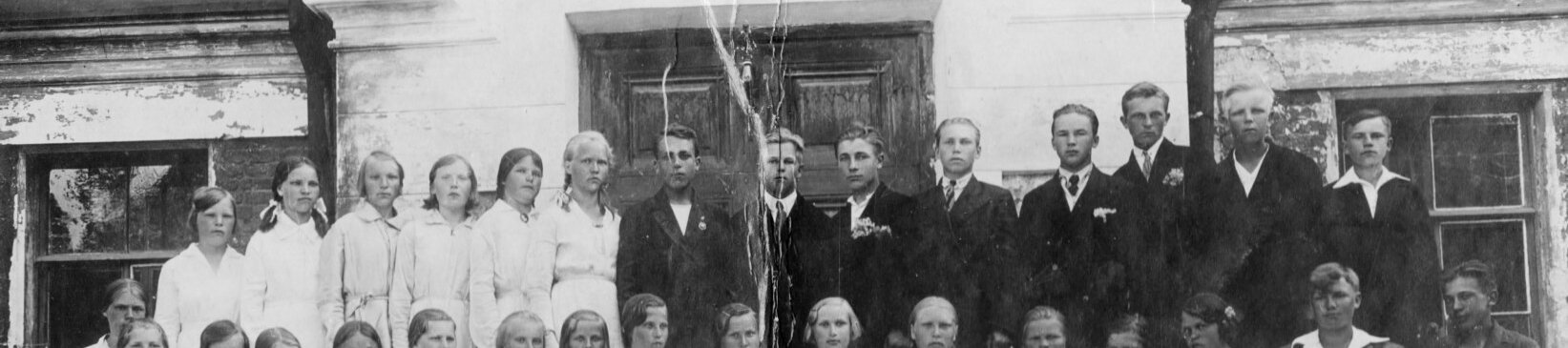 Venjoen seurakunnan rippilapset v. 1935. Rippi-isä Pekka Brax istuu viiksekkäänä toisessa rivissä mustapukuisen miehen oikealla puolella. (Kuvan luovuttaja Liidia Judanova)
